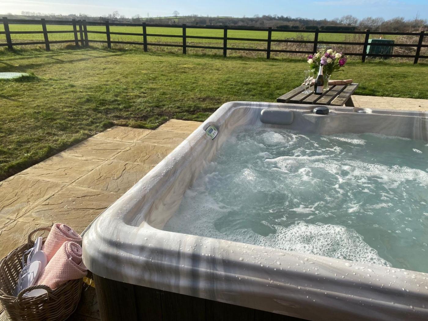 The holiday home with a patio and garden views features 2 bedrooms, a living room, a flat-screen TV, an equipped kitchen with a dishwasher and an oven, and 1 bathroom with a hot tub. Towels and bed linen are provided in the holiday home. There is also a seating area and a fireplace.