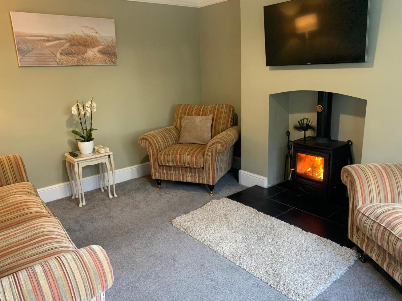 Holiday Home. This holiday home features a fireplace. The holiday home offers a dining area, a wardrobe, as well as a shared bathroom boasting a bath and a shower. The well-fitted kitchen has a stovetop, a refrigerator, a dishwasher and kitchenware. The holiday home features a washing machine, a private entrance, a seating area, a flat-screen TV with streaming services, as well as garden views. The unit has 3 beds.
