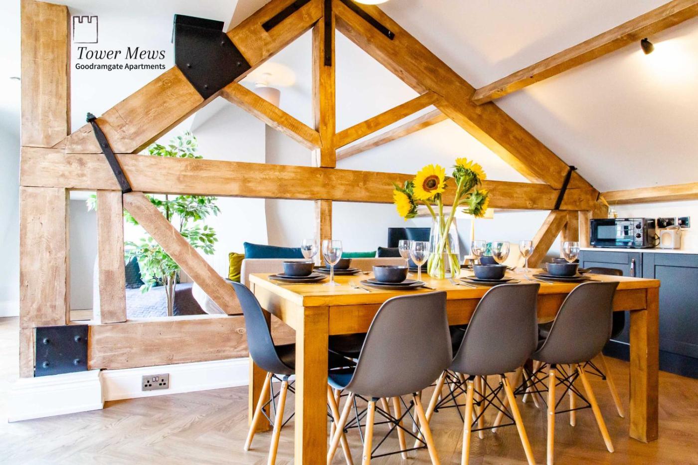 One-Bedroom Apartment (4 Adults) - Monks Loft. Second-floor open-plan apartment in a Grade II listed building. It is decorated in a contemporary style and has a unique location, nestled alongside the city walls. Please note that this apartment is up 2 flights of stairs. ;